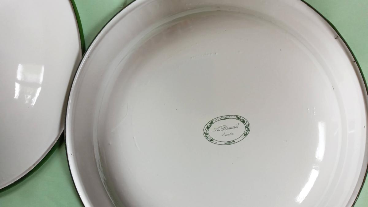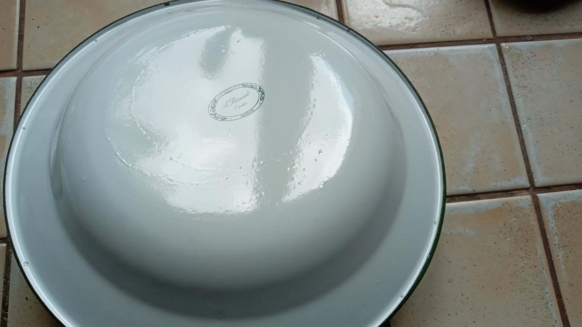Particularité: ces assiettes émaillées comportent au dos dans l'émail blanc quelques taches et "lignures" (lignes pointillées) plus nettement visibles en lumière indirecte qui n'affectent en rien l'usage et la durabilité de l'article (voir photos 2 et 3). Hormis cela les assiettes jardin sont en parfait état et totalement fonctionnelles et saines.