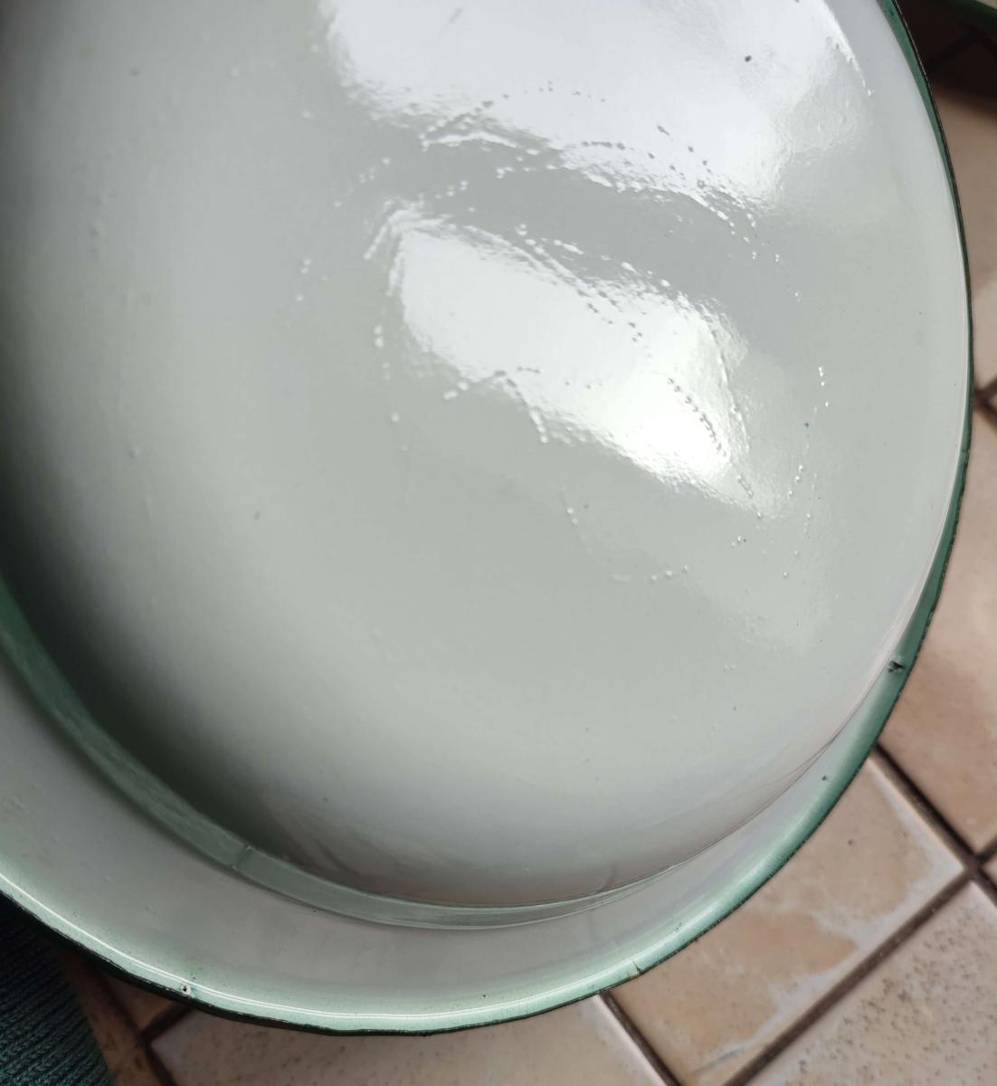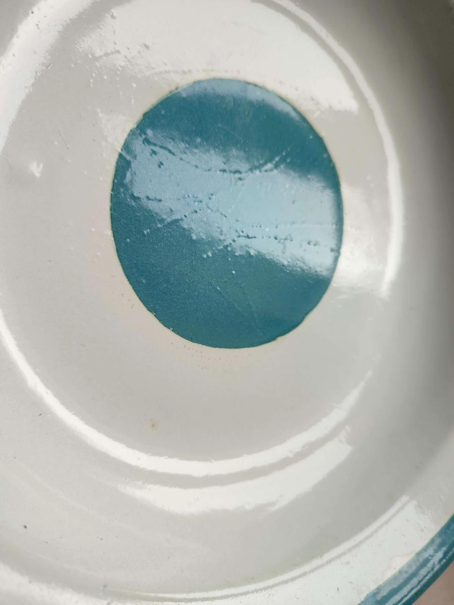 Particularité: ces assiettes émaillées comportent ce qu'on appelle des lignures, lignes pointillées dans l'émail blanc, visibles en lumière indirecte (photos 2 à 5), ne nuisant en rien à l'usage et la longévité de l'article.