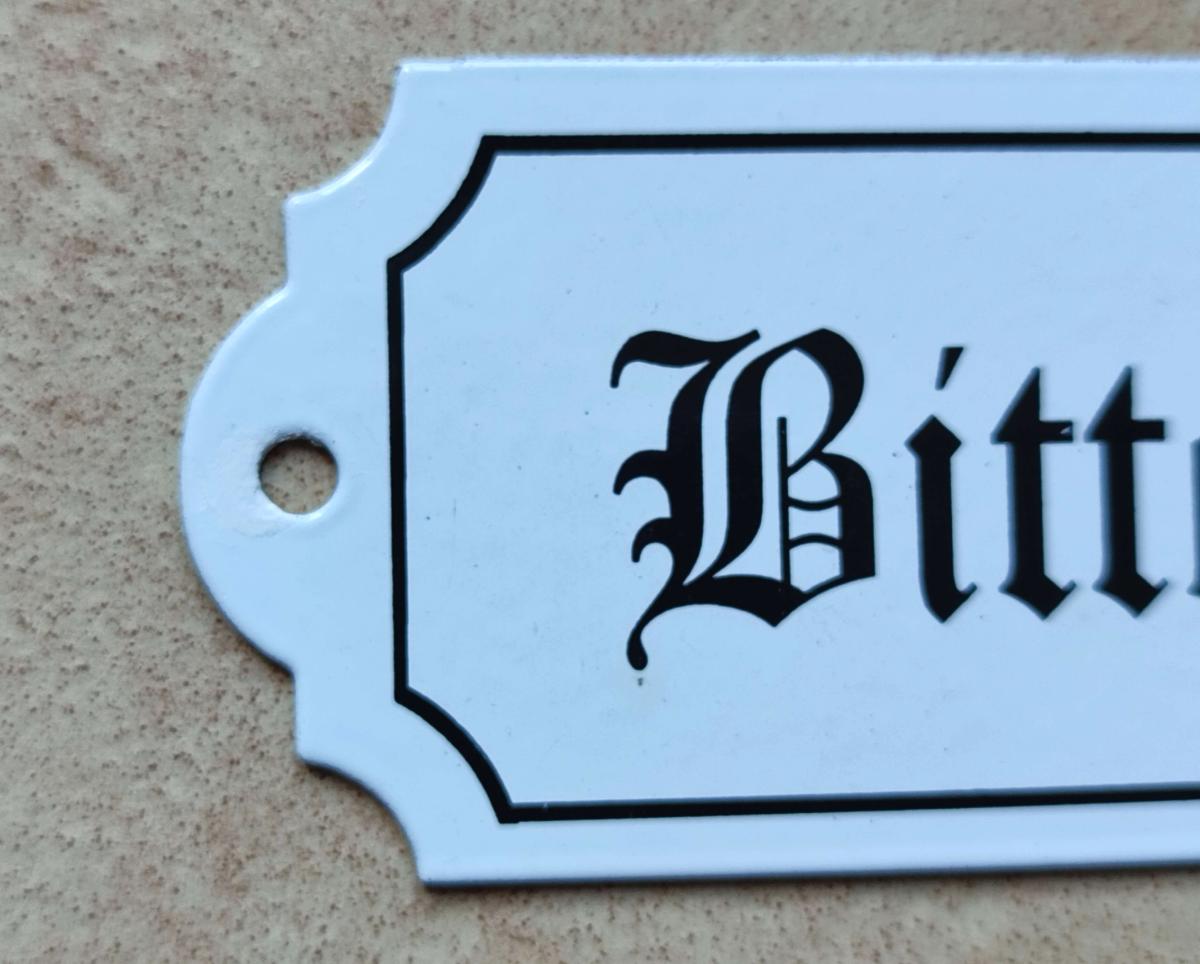 Plaque de porte émaillée, Bitte lauten, émail blanc, filet, design ancien