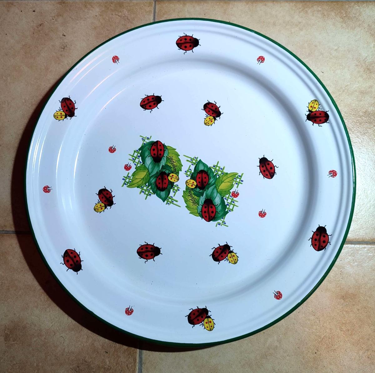 Grand plateau émaillé diamètre 40 cm blanc décor coccinelle