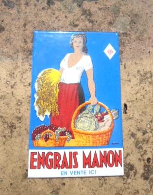 Magnet émail ancienne Pub Engrais Manon: plaque émaillée Vintage aimantée