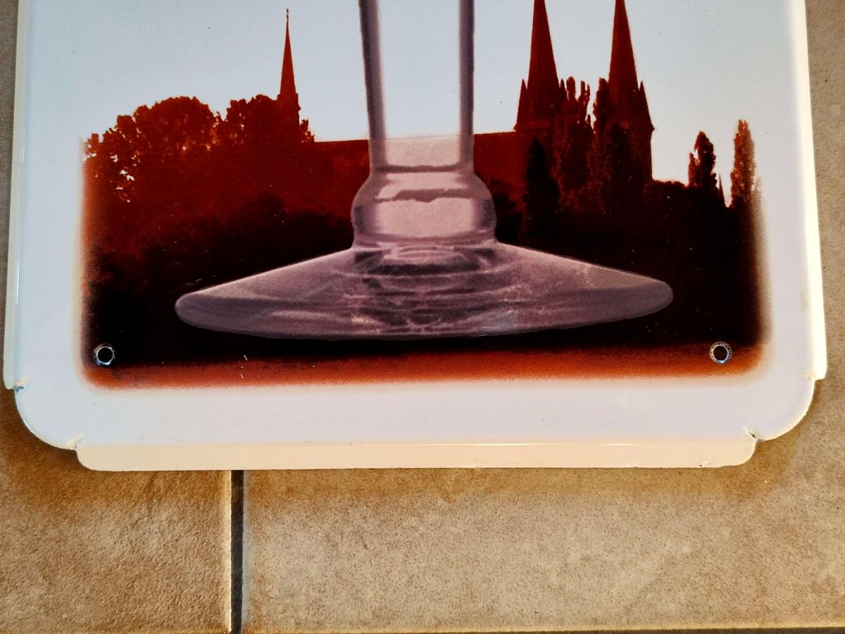 x 27 cm, plis sur les 4 côtés donnant du volume, 4 trous de fixation. La plaque émail a une très belle luminosité: on distingue dans le verre de cette jolie bière brune un reflet dans la mousse onctueuse et le slogan publicitaire en filigrane noir Trappistenbier; la plaque émaillée bière sublime l'effet de la publicité par laquelle la couleur de la bière brune se fait alléchante (à boire avec modération).