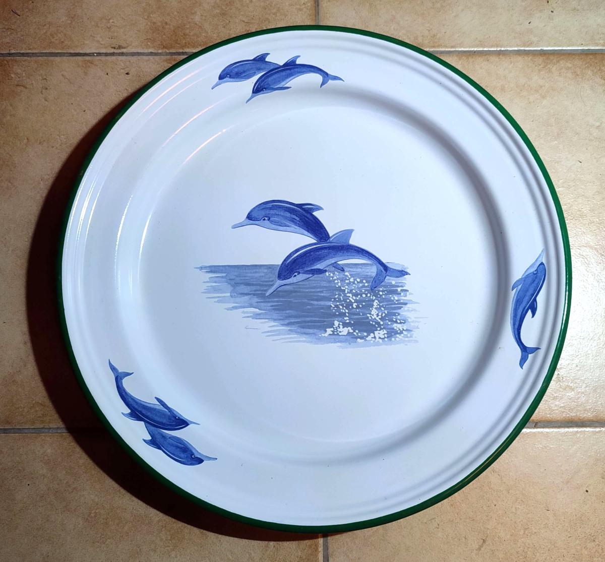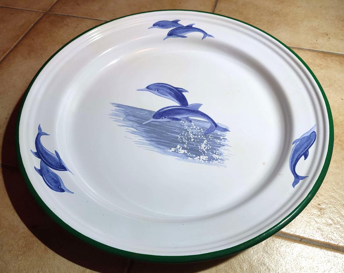 Offrez ou offrez-vous ce plat ou plateau émaillé motif dauphin, un excellent rapport qualité/prix.